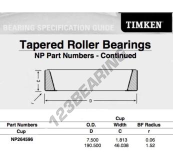 Il Cassa, noto come NP264596-TIMKEN TIMKEN, ha un diametro interno di mm, un diametro esterno di 190.5 mm e uno spessore di 46.038 mm.