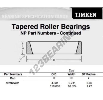 Il Cassa, noto come NP266492-TIMKEN TIMKEN, ha un diametro interno di mm, un diametro esterno di 110 mm e uno spessore di 18.824 mm.