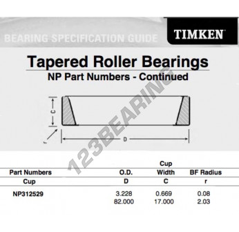 Il Cassa, noto come NP312529-TIMKEN TIMKEN, ha un diametro interno di mm, un diametro esterno di 82 mm e uno spessore di 17 mm.
