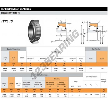 Il Cuscinetto Conico, noto come 1774-1729-TIMKEN TIMKEN, ha un diametro interno di 19 mm, un diametro esterno di 56.9 mm e uno spessore di 19.37 mm.