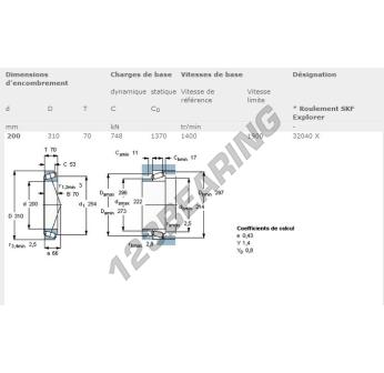 Il Cuscinetto Conico, noto come 32040X-SKF SKF, ha un diametro interno di 200 mm, un diametro esterno di 310 mm e uno spessore di 70 mm.