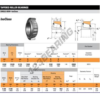 Il Cuscinetto Conico, noto come 32213-TIMKEN TIMKEN, ha un diametro interno di 65 mm, un diametro esterno di 120 mm e uno spessore di 32.75 mm.