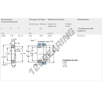 Il Cuscinetto Conico, noto come 32226J2-SKF SKF, ha un diametro interno di 130 mm, un diametro esterno di 230 mm e uno spessore di 67.75 mm.