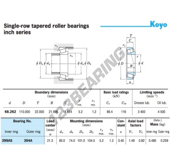 Il Cuscinetto Conico, noto come 399AS-394A-JTEKT JTEKT, ha un diametro interno di 68.26 mm, un diametro esterno di 110 mm e uno spessore di 22 mm.