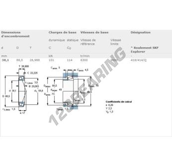 Il Cuscinetto Conico, noto come 418-414-Q-SKF SKF, ha un diametro interno di 38.1 mm, un diametro esterno di 88.5 mm e uno spessore di 26.99 mm.