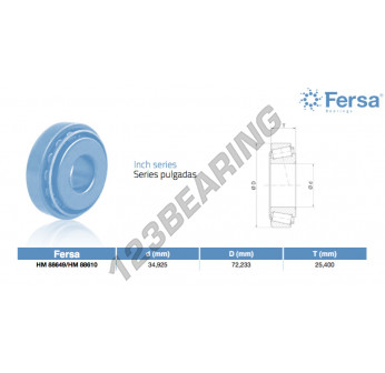 Il Cuscinetto Conico, noto come HM88649-HM88610-ASFERSA ASFERSA, ha un diametro interno di 34.925 mm, un diametro esterno di 72.233 mm e uno spessore di 25.4 mm.