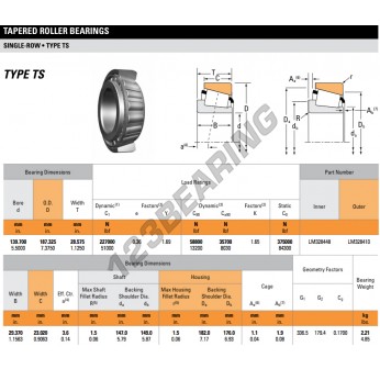 Il Cuscinetto Conico, noto come LM328448-LM328410-TIMKEN TIMKEN, ha un diametro interno di 139.7 mm, un diametro esterno di 187.325 mm e uno spessore di 28.575 mm.