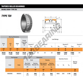 Il Cuscinetto Conico, noto come M252349D-M252310-TIMKEN TIMKEN, ha un diametro interno di 269.875 mm, un diametro esterno di 381 mm e uno spessore di 136.525 mm.