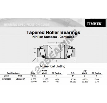 Il Cuscinetto Conico, noto come NP972299-NP698197-TIMKEN TIMKEN, ha un diametro interno di 50.8 mm, un diametro esterno di 95.25 mm e uno spessore di 27.783 mm.