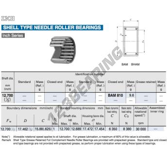 Il Gusci A Rullini, noto come BAM810-IKO IKO, ha un diametro interno di 12.7 mm, un diametro esterno di 17.46 mm e uno spessore di 15.88 mm.