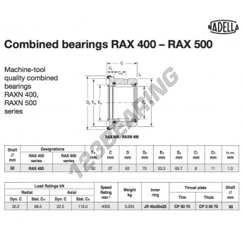 Il Gusci A Rullini, noto come RAX450-NADELLA NADELLA, ha un diametro interno di 50 mm, un diametro esterno di 62 mm e uno spessore di 27 mm.