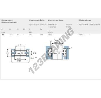 Il Cuscinetti Assiali A Sfere, noto come 52311-SKF SKF, ha un diametro interno di 45 mm, un diametro esterno di 105 mm e uno spessore di 64 mm.