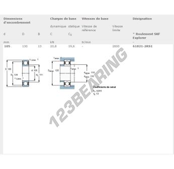 Il Cuscinetti A Sfera, noto come 61821-2RS-SKF SKF, ha un diametro interno di 105 mm, un diametro esterno di 130 mm e uno spessore di 13 mm.