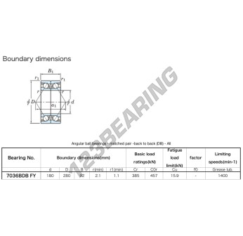 Il Cuscinetti A Sfera, noto come 7036-BDB-FY-JTEKT JTEKT, ha un diametro interno di 180 mm, un diametro esterno di 280 mm e uno spessore di 92 mm.