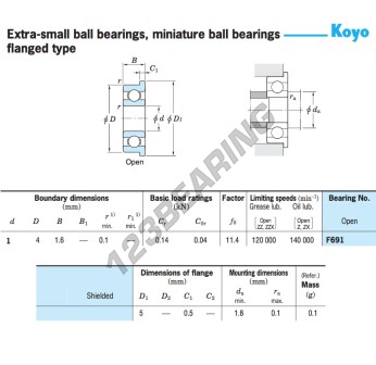 Il Cuscinetti A Sfera, noto come F691-JTEKT JTEKT, ha un diametro interno di 1 mm, un diametro esterno di 4 mm e uno spessore di 1.6 mm.