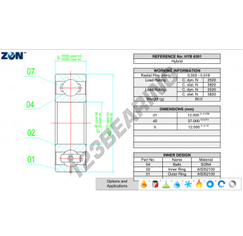 Il Cuscinetti A Sfera, noto come HYB-6301-ZEN ZEN, ha un diametro interno di 12 mm, un diametro esterno di 37 mm e uno spessore di 12 mm.