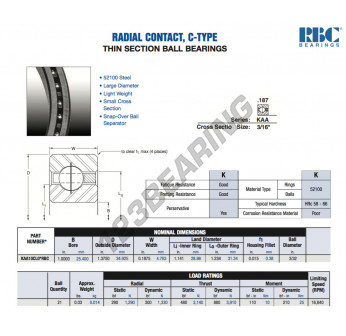Il Cuscinetti A Sfera, noto come KAA10-CL0-RBC RBC, ha un diametro interno di 25.4 mm, un diametro esterno di 34.925 mm e uno spessore di 4.763 mm.