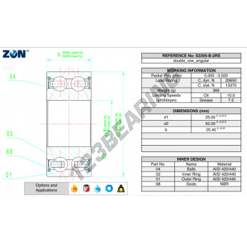 Il Cuscinetti A Sfera, noto come S3305-B-2RS-ZEN ZEN, ha un diametro interno di 25 mm, un diametro esterno di 62 mm e uno spessore di 25.4 mm.