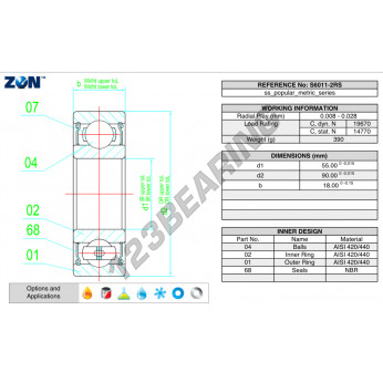 Il Cuscinetti A Sfera, noto come S6011-2RS-ZEN ZEN, ha un diametro interno di 55 mm, un diametro esterno di 90 mm e uno spessore di 18 mm.