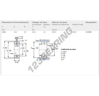 Il Cuscinetti Orientabili A Sfere, noto come 13948-SKF SKF, ha un diametro interno di 240 mm, un diametro esterno di 320 mm e uno spessore di 60 mm.