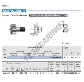 Il Rullo Della Camma Con Asse, noto come CFKR90-VUU-IKO IKO, ha un diametro interno di 30 mm, un diametro esterno di 90 mm e uno spessore di 35 mm.