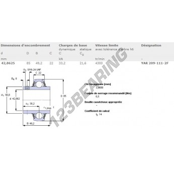 Il Accessorio Di Supporto noto come YAR209-111-2F-SKF SKF misura 42.86 mm in diametro interno, 85 mm in diametro esterno e 49.2 mm in spessore. È prodotto in ghisa.