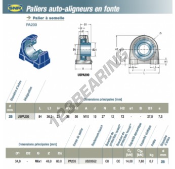Il Supporto In Ghisa - 2 Fissaggi noto come USPA205-SNR SNR ha un diametro dell'albero di 25 mm e un interasse di 56 mm. Questo numero di parte è prodotto in ghisa e il tipo di serraggio è .