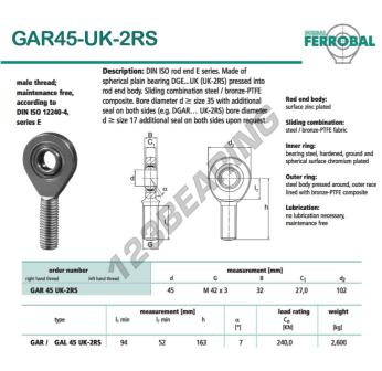 Il Giunti Sferici Ge noto come GAR45-UK-2RS-DURBAL DURBAL ha un diametro interno di 45 mm, un diametro esterno di 102 mm e uno spessore di 32 mm.