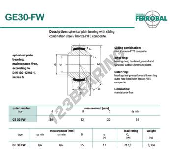 Il Giunti Sferici Geew noto come DGE30-FW-DURBAL DURBAL ha un diametro interno di 30 mm, un diametro esterno di 55 mm e uno spessore di 20 mm.