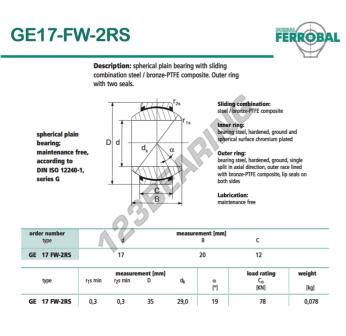 Il Giunti Sferici Geew noto come GE17-FW-2RS-DURBAL DURBAL ha un diametro interno di 17 mm, un diametro esterno di 35 mm e uno spessore di 12 mm.