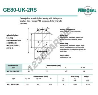 Il Giunti Sferici Geew noto come GE80-UK-2RS-DURBAL DURBAL ha un diametro interno di 80 mm, un diametro esterno di 120 mm e uno spessore di 45 mm.