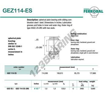 Il Giunti Sferici Geew noto come GEZ114-ES-DURBAL DURBAL ha un diametro interno di 114.3 mm, un diametro esterno di 177.8 mm e uno spessore di 85.725 mm.