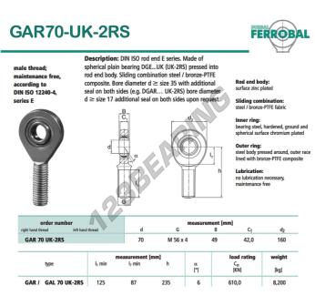 Il Giunti Sferici Sa noto come GAR70-UK-2RS-DURBAL DURBAL ha un passo della vite di , un diametro interno di 70 mm, un diametro esterno di 160 mm e uno spessore di 49 mm.