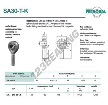 Il Giunti Sferici Sa noto come SA30-T-K-DURBAL DURBAL ha un passo della vite di , un diametro interno di 30 mm, un diametro esterno di 70 mm e uno spessore di 37 mm.
