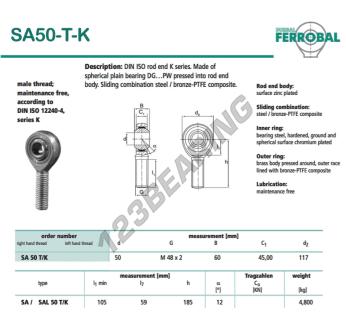 Il Giunti Sferici Sa noto come SA50-T-K-DURBAL DURBAL ha un passo della vite di , un diametro interno di 50 mm, un diametro esterno di 117 mm e uno spessore di 60 mm.