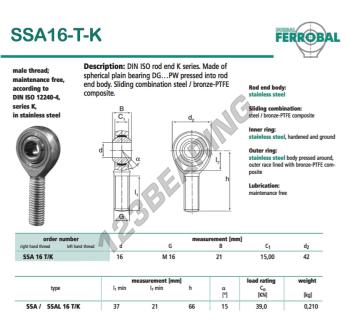 Il Giunti Sferici Sa noto come SSA16-T-K-DURBAL DURBAL ha un passo della vite di , un diametro interno di 16 mm, un diametro esterno di 42 mm e uno spessore di 21 mm.