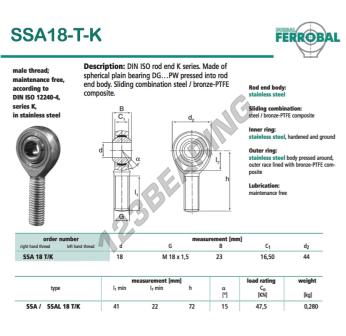 Il Giunti Sferici Sa noto come SSA18-T-K-DURBAL DURBAL ha un passo della vite di , un diametro interno di 18 mm, un diametro esterno di 44 mm e uno spessore di 23 mm.