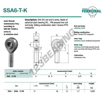 Il Giunti Sferici Sa noto come SSA6-T-K-DURBAL DURBAL ha un passo della vite di , un diametro interno di 6 mm, un diametro esterno di 20 mm e uno spessore di 9 mm.