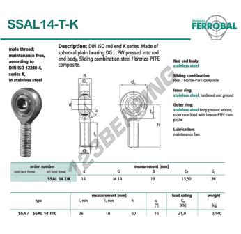 Il Giunti Sferici Sa noto come SSAL14-T-K-DURBAL DURBAL ha un passo della vite di , un diametro interno di 14 mm, un diametro esterno di 36 mm e uno spessore di 19 mm.
