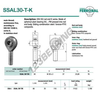 Il Giunti Sferici Sa noto come SSAL30-T-K-DURBAL DURBAL ha un passo della vite di , un diametro interno di 30 mm, un diametro esterno di 70 mm e uno spessore di 37 mm.