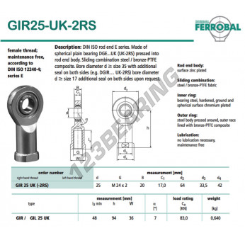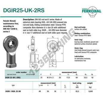 Il Giunti Sferici Si noto come DGIR25-UK-2RS-DURBAL DURBAL ha un diametro interno di 25 mm, un diametro esterno di 64 mm e uno spessore di 20 mm.