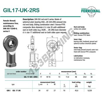 Il Giunti Sferici Si noto come GIL17-UK-2RS-DURBAL DURBAL ha un diametro interno di 17 mm, un diametro esterno di 46 mm e uno spessore di 14 mm.