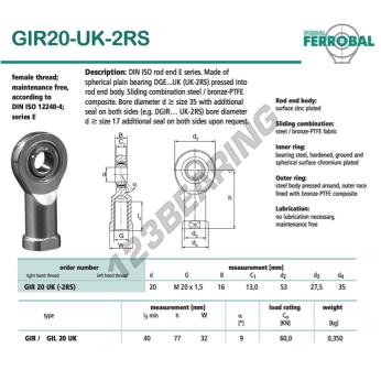 Il Giunti Sferici Si noto come GIR20-UK-2RS-DURBAL DURBAL ha un diametro interno di 20 mm, un diametro esterno di 53 mm e uno spessore di 16 mm.