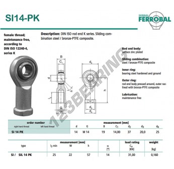 Il Giunti Sferici Si noto come SI14-PK-DURBAL DURBAL ha un diametro interno di 14 mm, un diametro esterno di 37 mm e uno spessore di 19 mm.