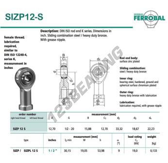 Il Giunti Sferici Si noto come SIZP12-S-DURBAL DURBAL ha un diametro interno di 12.7 mm, un diametro esterno di 33.32 mm e uno spessore di 15.88 mm.