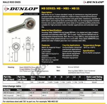 Il Giunti Sferici Tsm noto come MBL-12-DUNLOP DUNLOP ha un passo della vite di , un diametro interno di 19.05 mm, un diametro esterno di 44.45 mm e uno spessore di 22.225 mm.